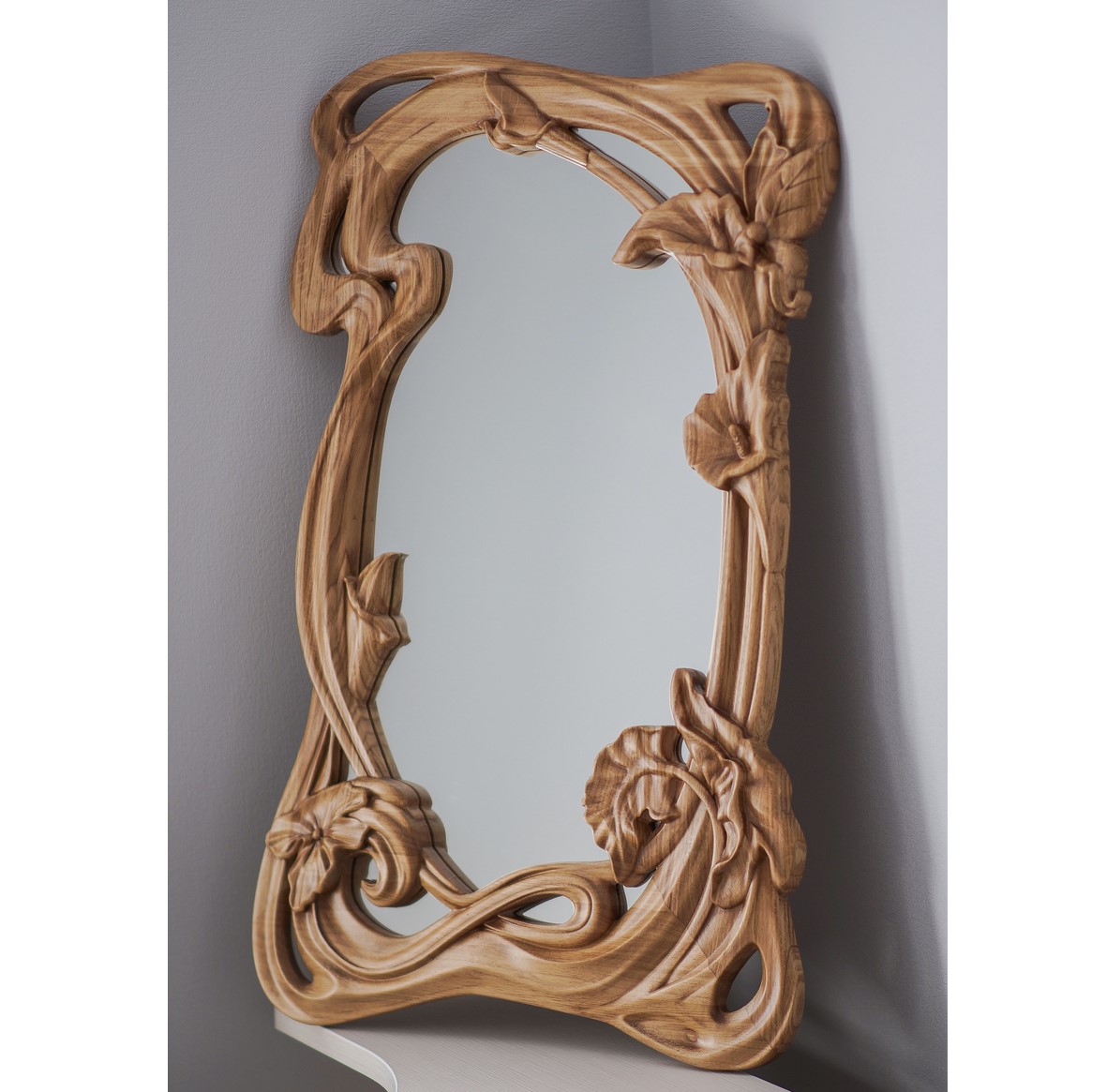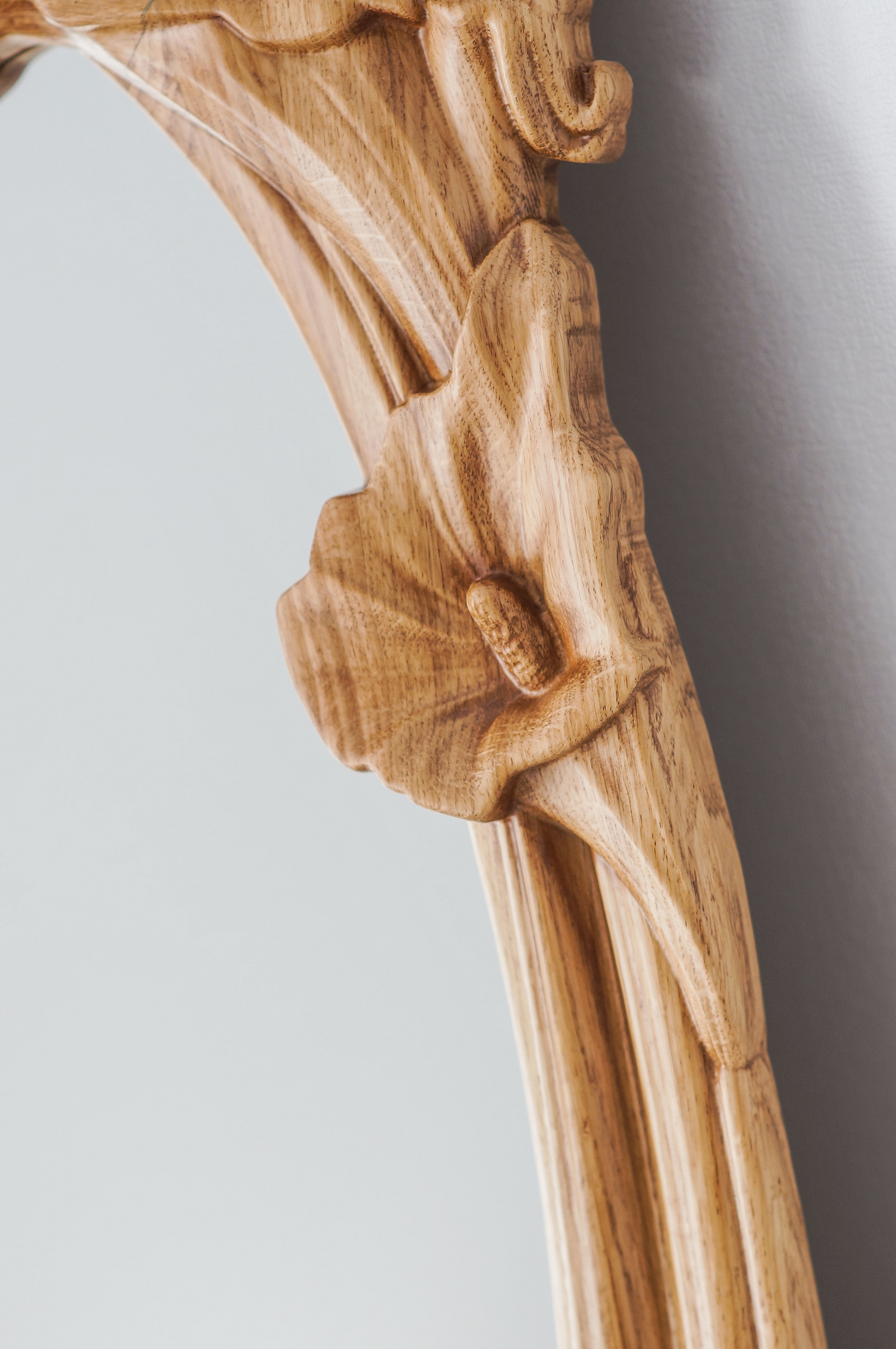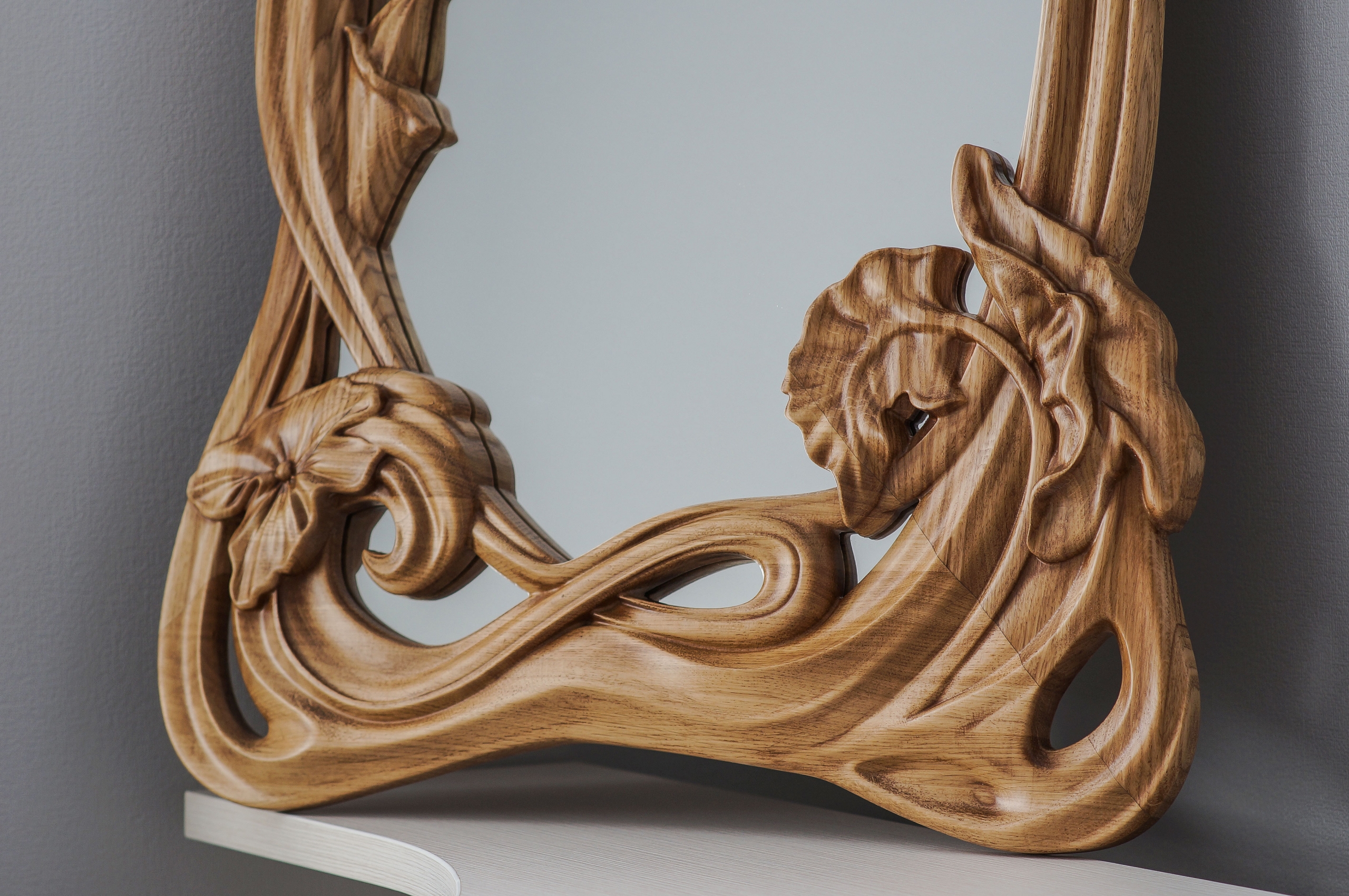 Unique carved oak mirror for your interior (900 х 600 х 40). Oak frame is varnished with the patine effect. The mirror is designed in Art-Deco style. Limited Edition.